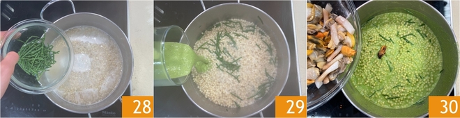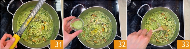 Após cerca de 6–7 minutos, adicione os 100 g de salicornia cortada grosseiramente 28 e cozinhe a fregola adicionando líquido quando necessário, por um total de 12–14 minutos (depende do tamanho). Quando faltar um minuto, incorpore 3–4 colheres de sopa de emulsão de salicornia 29 e misture energicamente até o final do tempo de cozimento da fregola. Neste ponto, desligue o fogo e adicione três quartos dos frutos do mar 30.