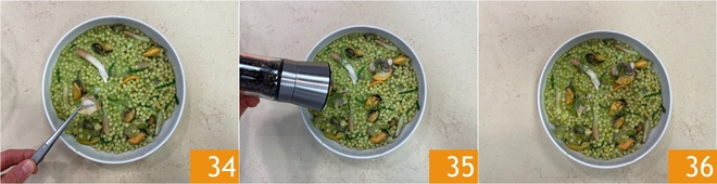 Para empratar, disponha a fregola no centro do prato 34, decore com os moluscos inteiros reservados 34, alguns ramos de endro ou funcho fresco, uma pitada de pimenta preta 35, um fio de azeite cru e uma pitada final de casca de limão. Sirva imediatamente sua fregola com frutos do mar e salicornia 36!