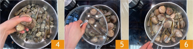 Adicione também os berbigões 4. Tampe com uma tampa 5 e espere que abram em fogo médio-baixo, mexendo de vez em quando 6. Quando estiverem todos abertos, coloque-os em uma tigela 6.