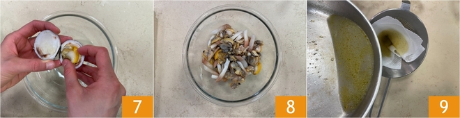 Retire as cascas dos frutos do mar 7 8 e coe o caldo de cozimento através de uma peneira revestida com um pano de cozinha para eliminar eventuais resíduos de areia 9 e reserve.