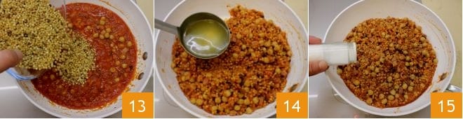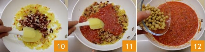 e continue cozinhando por mais 3-4 minutos 10. Neste ponto, adicione o molho de tomate 11, mexendo até começar a ferver levemente. Junte ao molho o grão-de-bico cozido e bem escorrido e continue cozinhando por mais 5 minutos 12.
