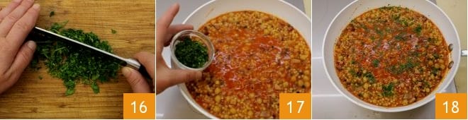 Quando a fregola estiver al dente, desligue o fogo e ajuste o sal e a pimenta. Pique finamente o maço de salsinha 16 e adicione como toque final 17. Mexa uma última vez e sua fregola com grão-de-bico e bacon está pronta 18: sirva bem quente!