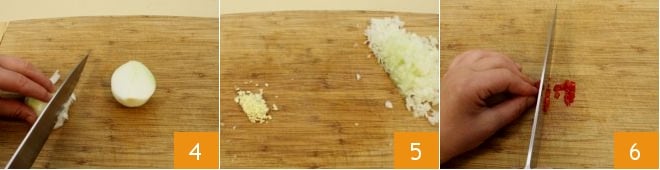 Limpe e pique finamente a cebola 1 e o alho 2, depois retire as sementes da pimenta fresca e pique-a também 3.