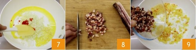 Em uma frigideira antiaderente grande regada com azeite de oliva, coloque para cozinhar o alho, a cebola e a pimenta: devem fritar por 5 minutos 7. Corte o bacon por último: fatie-o e depois corte em cubinhos 8. Adicione-o ao refogado 9.