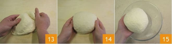 Neste ponto, transfira a mistura para uma bancada e trabalhe-a por cerca de dez minutos 13. Quando estiver lisa, dê-lhe uma forma esférica 14 e transfira para uma tigela grande 15.