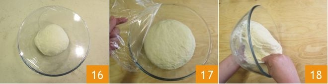 Cubra com filme plástico 16 e deixe fermentar por 2 horas em temperatura ambiente, ou até que tenha dobrado de volume 17. Em seguida, transfira novamente para a bancada 18
