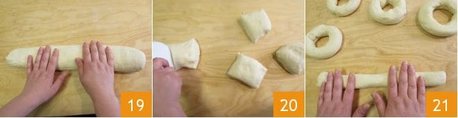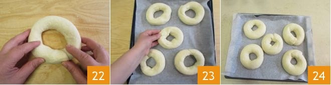 e feche-o em círculo para formar a rosca 22. Pressione delicadamente para unir as duas extremidades da massa. Transfira as rosquinhas para uma assadeira forrada com papel manteiga, mantendo-as bem espaçadas 23 e deixe fermentar por cerca de 1 hora 24.