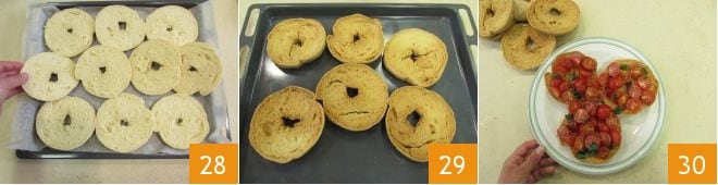 Coloque-as novamente na assadeira coberta com papel manteiga 28 e asse novamente por 40 minutos. Em seguida, abaixe o forno para 160° e espere mais 40 minutos. Desta forma, as friselle secarão bem por dentro e se ficarem muito claras, aumente novamente a temperatura para 180° até dourá-las na superfície, o que levará cerca de 10 minutos. Retire do forno 29 e deixe esfriar as friselle. Neste ponto, você pode conservá-las ou "molhá-las" antes de temperá-las a gosto com óleo, sal, pimenta, tomatinhos, manjericão 30 ou outros ingredientes como mussarela de búfala, anchovas, atum...