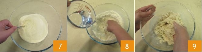 Misture com um garfo para combinar as duas farinhas 7; em seguida, despeje a água aos poucos 8 e comece a amassar com as mãos 9.
