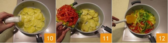 Adicione as batatas cortadas em fatias, ajustando o sal 10 e a pimenta, e deixe cozinhar em fogo médio por 3-4 minutos. Em seguida, adicione os pimentões em tiras 11 e cozinhe por mais 7-8 minutos, mexendo com uma espátula 12.