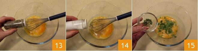 Em uma tigela à parte, bata os ovos temperando com sal e pimenta (13-14), manjerona e tomilho 15;