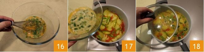 misture tudo com o batedor para incorporar bem os ingredientes 16. Quando os legumes estiverem prontos, adicione os ovos batidos 17 e continue cozinhando por 10 minutos em fogo baixo, cobrindo com uma tampa 18.
