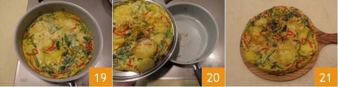 Depois do tempo necessário 19, com a ajuda da tampa, vire a fritada 20 e cozinhe por 2-3 minutos do outro lado. Uma vez pronta, você poderá servir e saborear sua fritada de batatas e pimentões 21.
