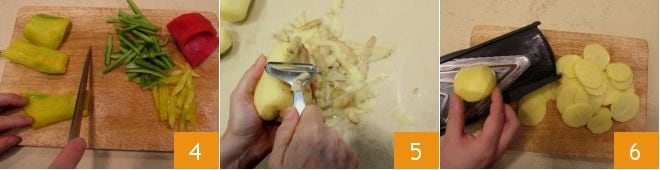 depois corte-os em tiras de 0,5 cm de espessura 4. Descasque as batatas 5 e com um mandolim, corte-as em fatias de 2-3 mm de espessura 6.