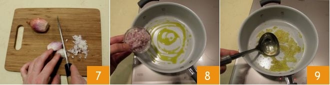 Pique finamente a chalota 7, frite-a em uma panela grande antiaderente com o azeite 8, depois adicione o caldo de legumes quente 9.