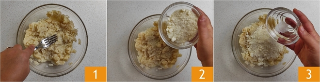 Para preparar os bolinhos de couve-flor, como primeira coisa coloque os buquês cozidos no vapor em uma tigela e amasse com um garfo 1. Em seguida, adicione o parmesão 2 e o sal 3.