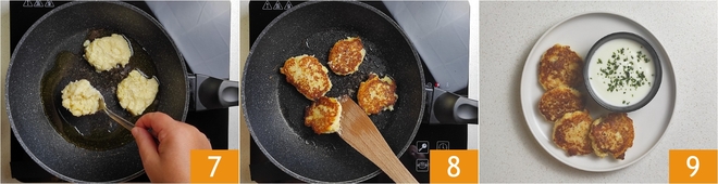 Em uma frigideira antiaderente, aqueça o óleo, pegue 3-4 colheres de sopa da massa, coloque na frigideira 7 e cozinhe em fogo médio por 2 minutos de cada lado ou até dourar 8. Os bolinhos de couve-flor estão prontos para serem servidos, talvez acompanhados de um molho de iogurte 9.