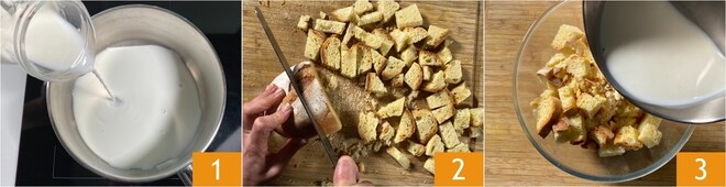 Para preparar as fritadas de pão, primeiro aqueça o leite em uma panela pequena 1, depois corte o pão seco em cubos 2. Transfira o pão para uma tigela e despeje o leite quente 3.