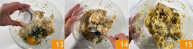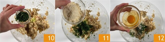 Adicione também a salsinha 10, o Parmigiano Reggiano DOP ralado 11 e o ovo 12.