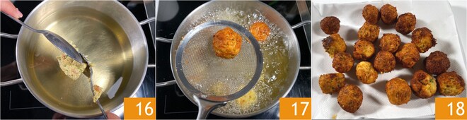 Forme bolinhas com as mãos ou mergulhe a massa no óleo usando outra colher 16. Frite alguns pedaços de cada vez até dourar para evitar que a temperatura do óleo baixe 17. Escorra em papel absorvente e saboreie as fritadas de pão ainda quentes 18!