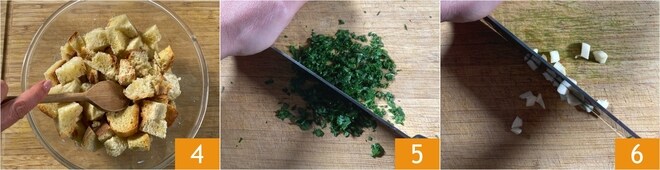 Misture com uma colher 4 e deixe descansar por alguns minutos, coberto com filme plástico. Enquanto isso, pique finamente a salsinha 5 e o dente de alho sem o miolo 6.