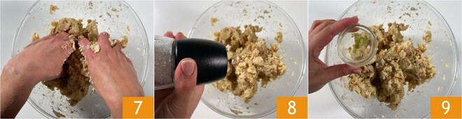 Despedace o pão embebido com as mãos 7, depois adicione sal, pimenta 8 e o alho picado 9.