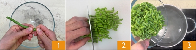 Para preparar a frittata com vagem na fritadeira a ar, comece pela limpeza da vagem: lave-as, retire as pontas 1 e corte em pedaços 2. Cozinhe em bastante água fervente com sal por cerca de 8 minutos 3, depois escorra e deixe esfriar um pouco.