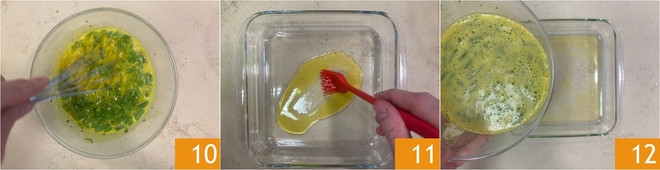 Misture bem tudo 10. Agora pegue uma assadeira de 22x22 cm, nós usamos uma de vidro que cabe confortavelmente dentro do cesto da fritadeira a ar, e pincele com um pouco de óleo 11. Despeje a mistura de ovos dentro 12.