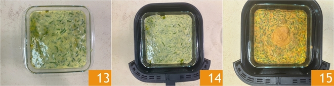 Neste ponto 13 transfira a assadeira para o cesto da fritadeira a ar (nós usamos uma fritadeira com capacidade de cerca de 6 litros) 14 e cozinhe a 180° por cerca de 20 minutos. Uma vez cozida 15 espere um par de minutos, então transfira a frittata de vagem da fritadeira a ar para uma tábua e sirva!
