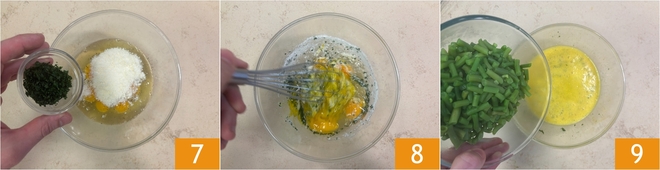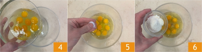 Quebre os ovos em uma tigela 4, adicione o sal 5, a pimenta e o queijo Parmesão ralado 6.