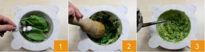 Para preparar a fritada com pesto e tomates, comece pelo pesto genovês (se você já tiver pesto caseiro disponível, pode usá-lo na quantidade indicada). Para consultar o procedimento completo, clique na ficha da Escola de Culinária que você encontra aqui: Pesto alla Genovese. Reduza o dente de alho a creme esmagando-o em um pilão (se você não tiver, pode usar o mixer). Em seguida, adicione as folhas de manjericão 1 junto com uma pitada de sal grosso. Esmague as folhas de manjericão contra as paredes do pilão, girando o pilão da esquerda para a direita e ao mesmo tempo o pilão no sentido contrário 2. Quando das folhas sair um líquido verde brilhante, adicione os pinhões e continue a esmagar. Depois, acrescente os queijos ralados aos poucos, continuando a esmagar; finalmente, despeje o azeite de oliva extravirgem em fio 3. Misture os ingredientes. Agora que o pesto está pronto, reserve-o coberto com filme plástico.