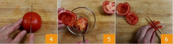 Dedique-se então a preparar os tomates. Lave-os sob água corrente, depois reduza um em cubos: elimine o pedúnculo e corte-o ao meio 4, depois escave o interior com uma colher para eliminar as sementes 5. Em seguida, retire da polpa os cubos 6 e guarde-os em uma tigelinha.
