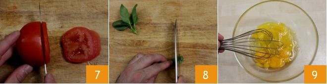 Passe para o outro tomate: elimine o pedúnculo e corte o tomate em fatias 7, que você reservará para a decoração. Em seguida, pique o maço de manjericão fresco 8, que depois você adicionará à fritada. Em uma tigela, quebre os ovos, salgue e apimente a gosto, depois comece a batê-los com um batedor 9.