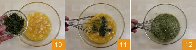 Depois de bater os ovos por alguns segundos, incorpore o pesto que você havia reservado 10 e misture com o batedor 11 para obter uma mistura homogênea 12.