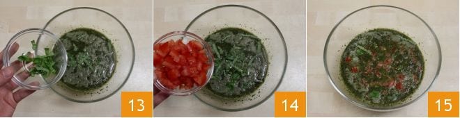 Depois adicione também o manjericão picado 13 e a polpa de tomates em cubos que você havia reservado 14. Em seguida, misture tudo novamente 15.