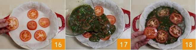 Agora você pode começar a compor sua fritada: pegue uma forma de 26 cm de diâmetro e forre-a com papel manteiga. Em seguida, coloque no fundo metade das fatias de tomate que você havia preparado anteriormente 16. Despeje a mistura de ovos, pesto e cubos de tomate na forma 17, nivelando a mistura para que preencha a forma de maneira uniforme e sem buracos. Depois termine de compor a fritada, dispondo as fatias de tomate restantes 18.