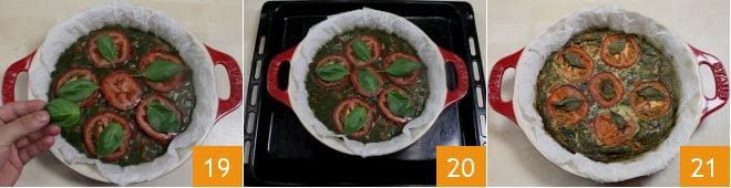 Decore a fritada com as folhas de manjericão inteiras 19, colocando-as sobre cada fatia de tomate para criar um contraste de cores. Em seguida, leve ao forno 20 pré-aquecido a 180° por 30-35 minutos ou forno ventilado a 160° por cerca de 25 minutos até que a superfície fique dourada (você também pode cozinhar a fritada em uma frigideira antiaderente como uma fritada normal). Retire do forno a fritada com pesto e tomates 21, deixe esfriar um pouco e sirva morna ou fria a gosto!