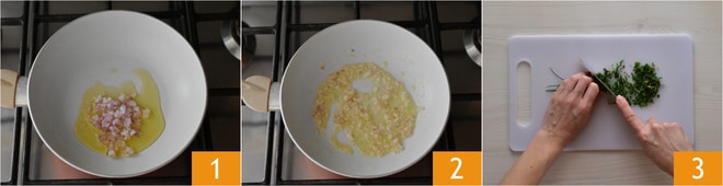 Para preparar o omelete de claras, descasque e pique a cebola, depois coloque-a na frigideira com um fio de óleo 1. Refogue por alguns minutos em fogo médio, mexendo de vez em quando, até que fique macia 2. Deixe a cebola refogada esfriar. Pique as ervas aromáticas 3.