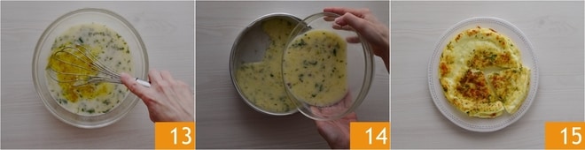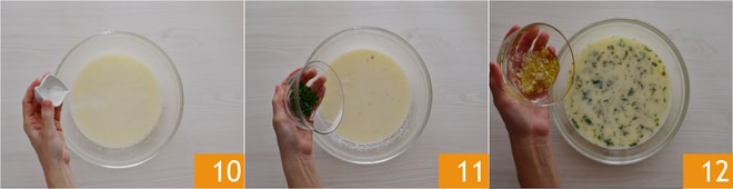 Adicione sal 10 e incorpore as ervas picadas 11. Enquanto isso, a cebola terá esfriado, adicione-a às claras 12.