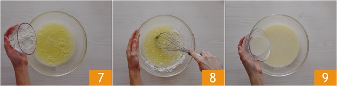 Adicione também o amido de batata 7, mexa até que seja absorvido 8, depois adicione o leite 9.