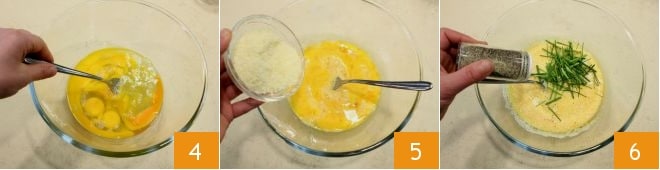 então bata-os com um garfo 4 e adicione o Grana ralado 5, misture e junte os ramos de cebolinha; sal e pimenta a gosto 6.