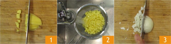 Para preparar a frittata sem ovos, primeiro descasque as batatas e corte-as em cubos de meio cm 1, depois enxágue sob água corrente 2 e transfira para uma tigela com água fria. Limpe a cebola e pique-a finamente 3.