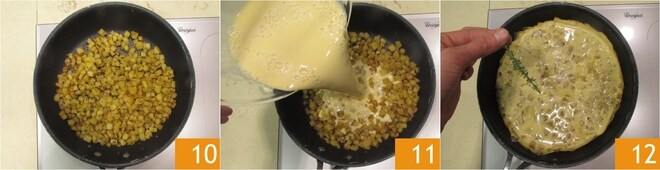 Cozinhe por 10-15 minutos em fogo médio, até que estejam douradas 10. Nesse ponto, mexa a massa e despeje na frigideira 11, girando-a levemente para distribuir uniformemente. Abaixe ligeiramente o fogo e perfume com tomilho 12.