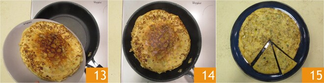 Cozinhe em fogo médio-baixo por 5-6 minutos, depois vire com a ajuda de um prato ou uma tampa 13 e continue cozinhando do outro lado por mais 5-6 minutos 14. Sua frittata sem ovos está pronta para ser servida 15!