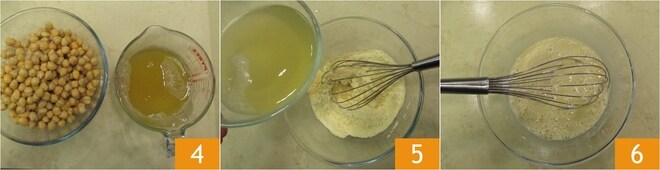 Escorra os grãos-de-bico (ou outras leguminosas) em conserva do seu líquido de conservação, a chamada aquafaba 4. Despeje a farinha de grão-de-bico em uma tigela junto com uma pitada de sal. Adicione aos poucos tanto a aquafaba 5 quanto a água natural, mexendo com um batedor para obter uma mistura lisa e fluida, sem grumos 6. Cubra a tigela com filme plástico e deixe descansar na geladeira por 10 minutos.