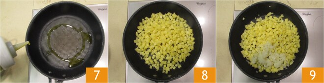 Aqueça um fio de óleo em uma frigideira antiaderente com diâmetro de 20 cm 7, depois adicione as batatas 8 e as cebolas 9, tempere com sal e pimenta.