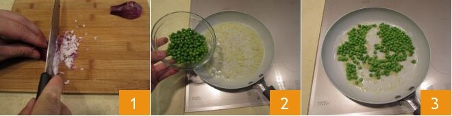Para preparar as frittatine de forno de espaguetinhos, comece cozinhando as ervilhas. Limpe e pique finamente a cebola 1, depois coloque-a em uma panela junto com metade do óleo, deixe refogar em fogo baixo e adicione as ervilhas 2. Cozinhe as ervilhas por 5-6 minutos 3, adicionando algumas colheres de sopa de água. Desligue o fogo, adicione sal, pimenta e deixe esfriar.