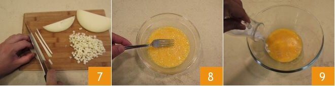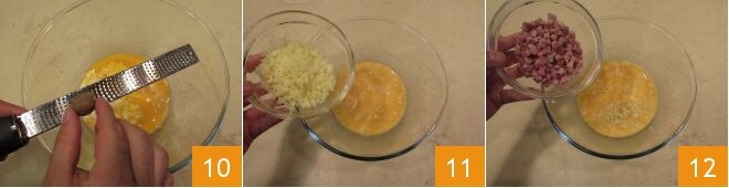 Neste ponto, corte também a provola na mesma espessura do presunto 7 e reserve os cubos. Em uma tigela suficientemente grande, quebre os ovos, bata-os 8 e adicione o leite 9.