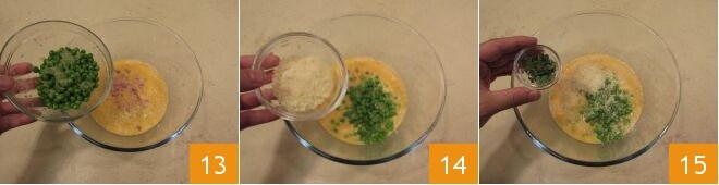 Adicione as ervilhas, já frias 13, o queijo parmesão ralado 14 e as folhinhas de manjerona 15.