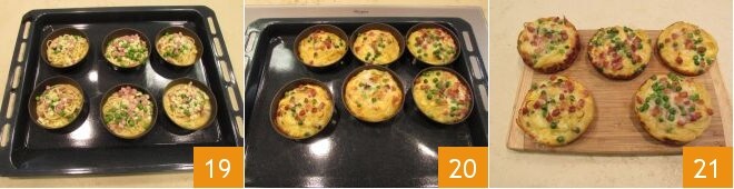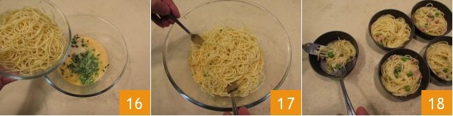 Por último, adicione os espaguetinhos cozidos 16 e misture tudo até incorporar todos os ingredientes 17. Divida a mistura obtida em 8 forminhas, com um diâmetro de 10 cm 18.